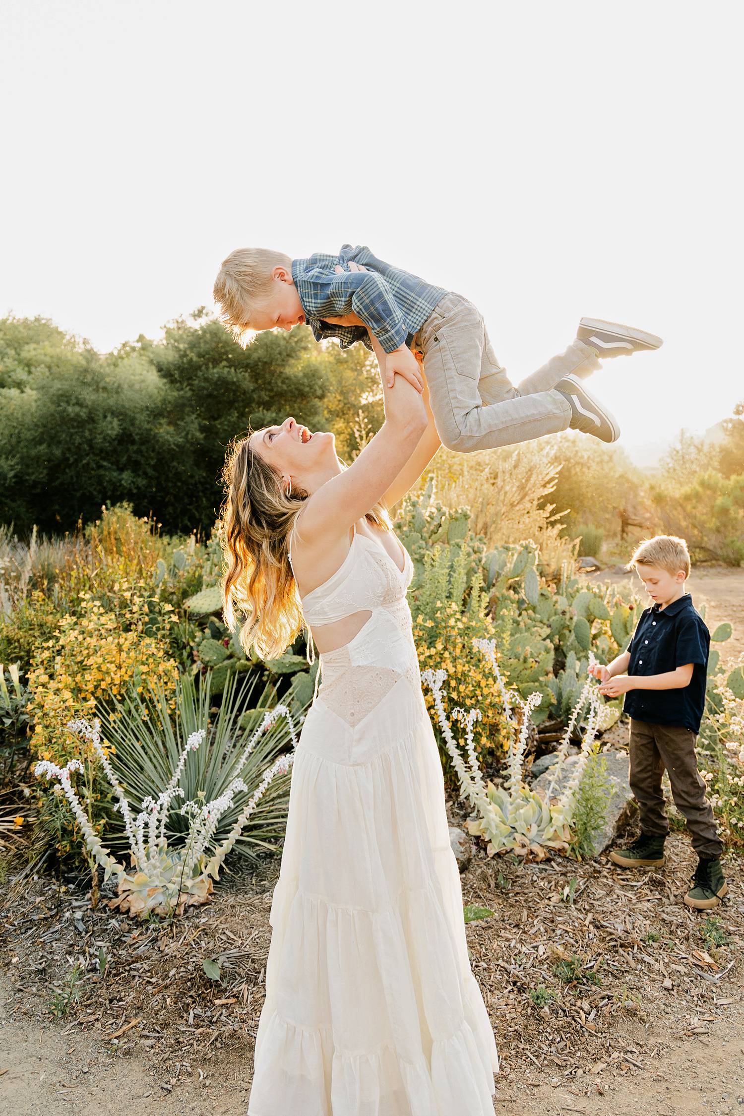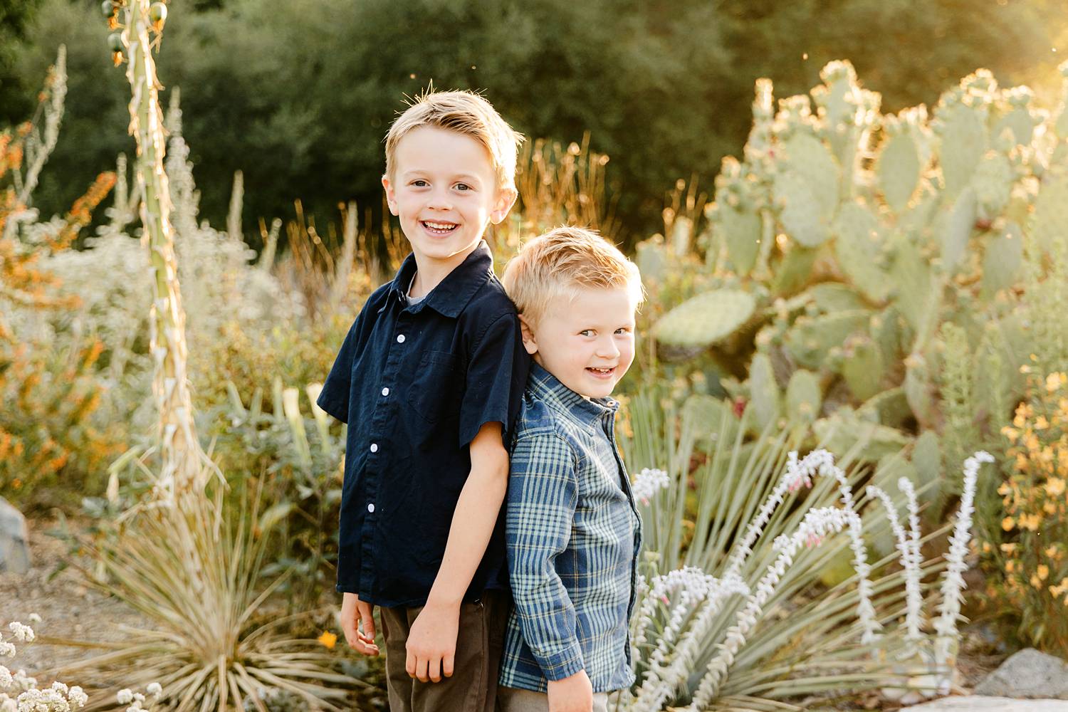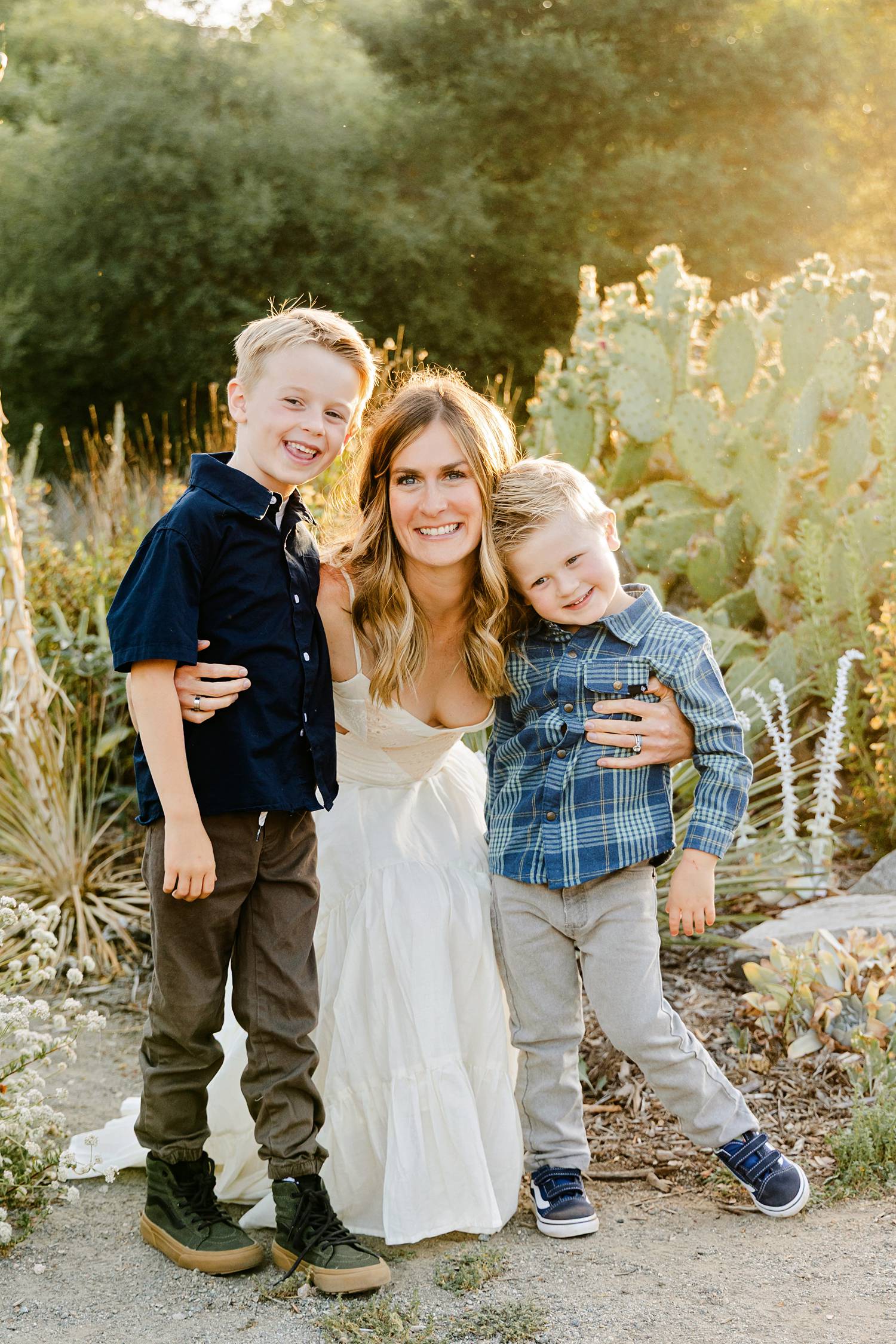 We photographed during golden hour in a beautiful California native plant garden, and the light was absolutely perfect. The warm, sun-kissed glow paired with the natural landscape created such a soft, timeless feel. The boys were laughing, spinning, and holding mom’s hands as they walked along the path—those in-between moments that make family photos feel real.