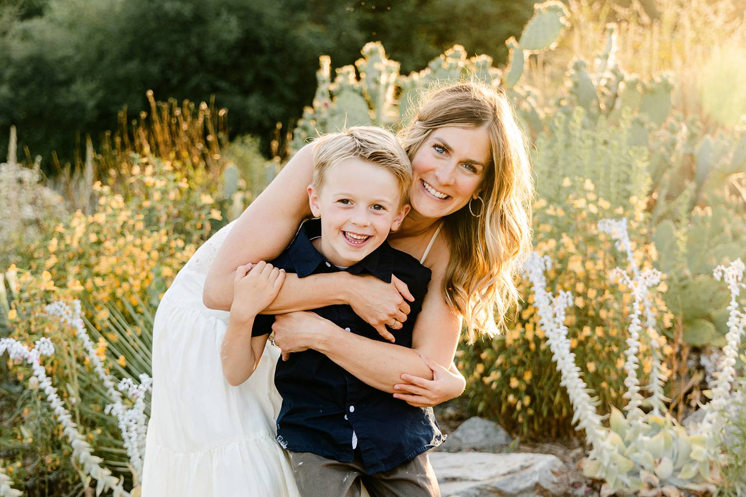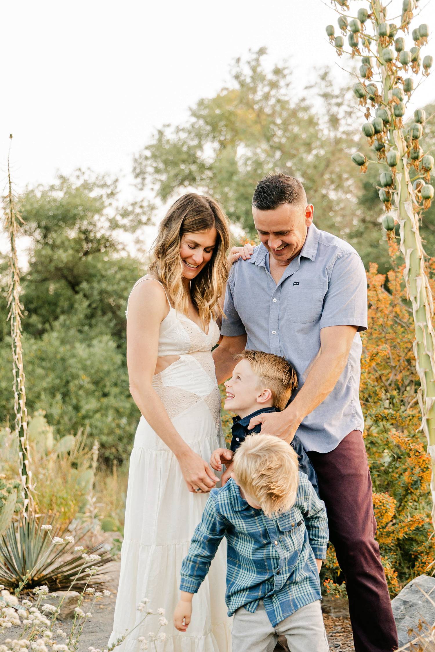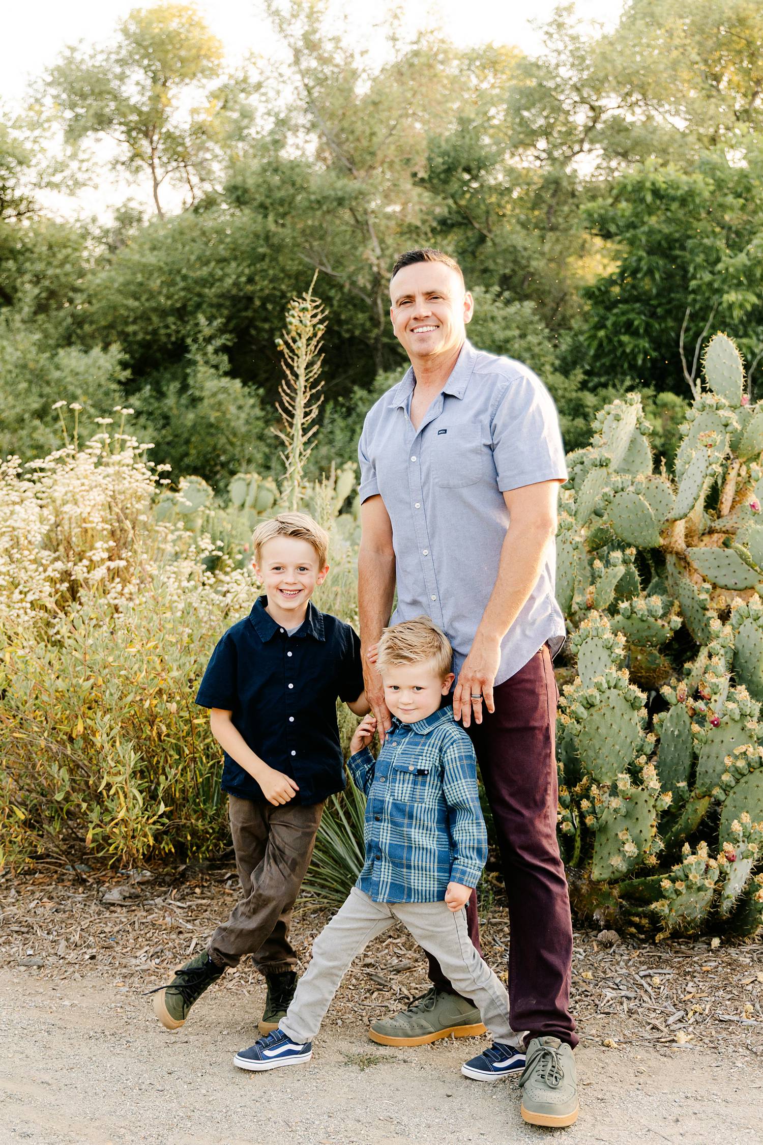 We photographed during golden hour in a beautiful California native plant garden, and the light was absolutely perfect. The warm, sun-kissed glow paired with the natural landscape created such a soft, timeless feel. The boys were laughing, spinning, and holding mom’s hands as they walked along the path—those in-between moments that make family photos feel real.